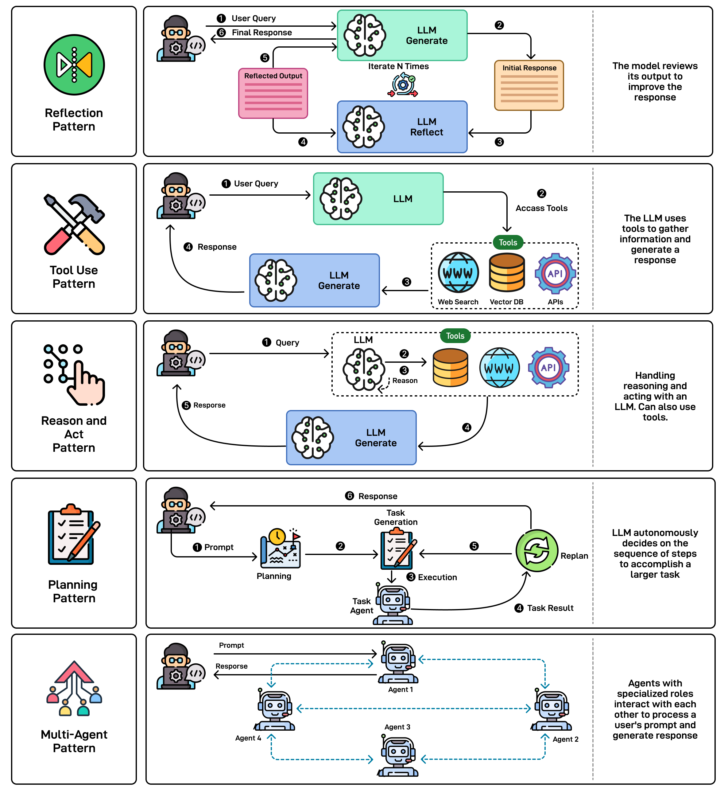 Dans cet article, nous allons passer en revue cinq patterns fondamentaux que l'on retrouve très souvent dans les systèmes agentiques modernes : la réflexion, l'usage d'outils, ReAct, la planification et les architectures multi-agents.